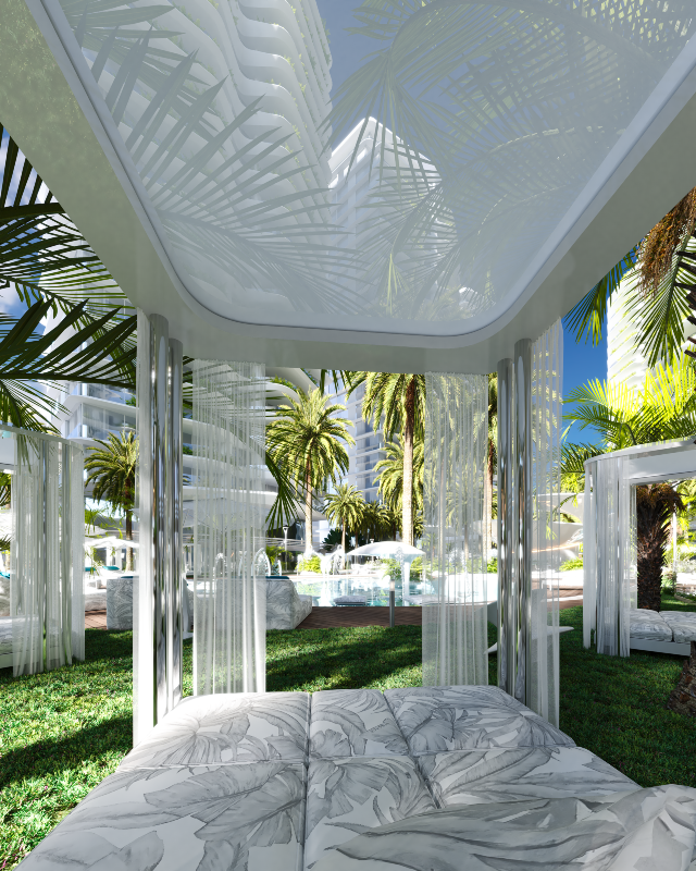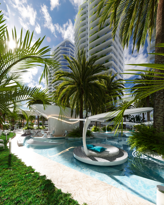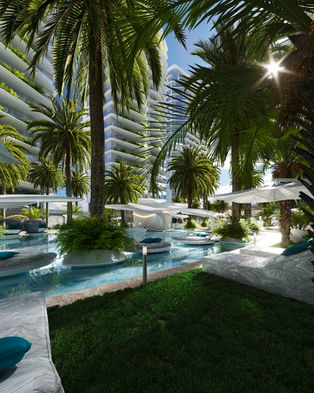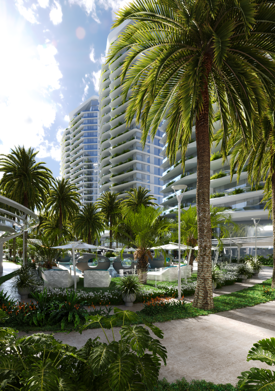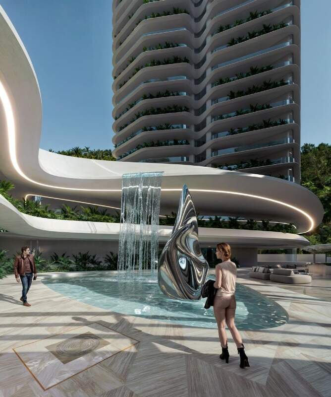 Um boulevard de acesso conecta as torres a um parque esportivo privado, e passarelas futurísticas ligam os edifícios ao Wellness Center, situado ao fundo do terreno, atrás de uma majestosa cascata.